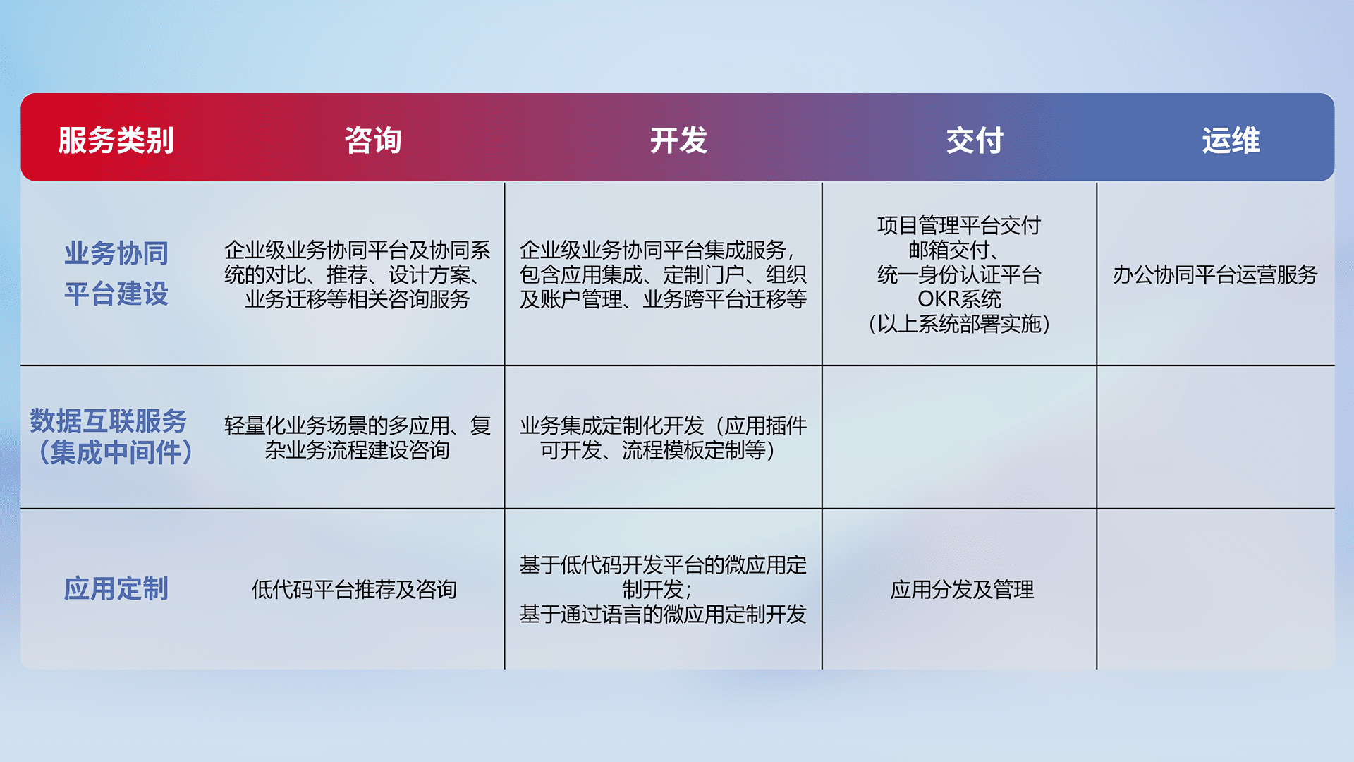 针对钉钉、、企微、、IDaas等平台级产品提供产品的规划、、方案、、、交付、、、、定制化开发等服务,,实现如统一协同办公、、、、智能客户服务、、、、混合会议管理、、智能数据查询、、、、等业务场景,,,,实现数字化转型。。。